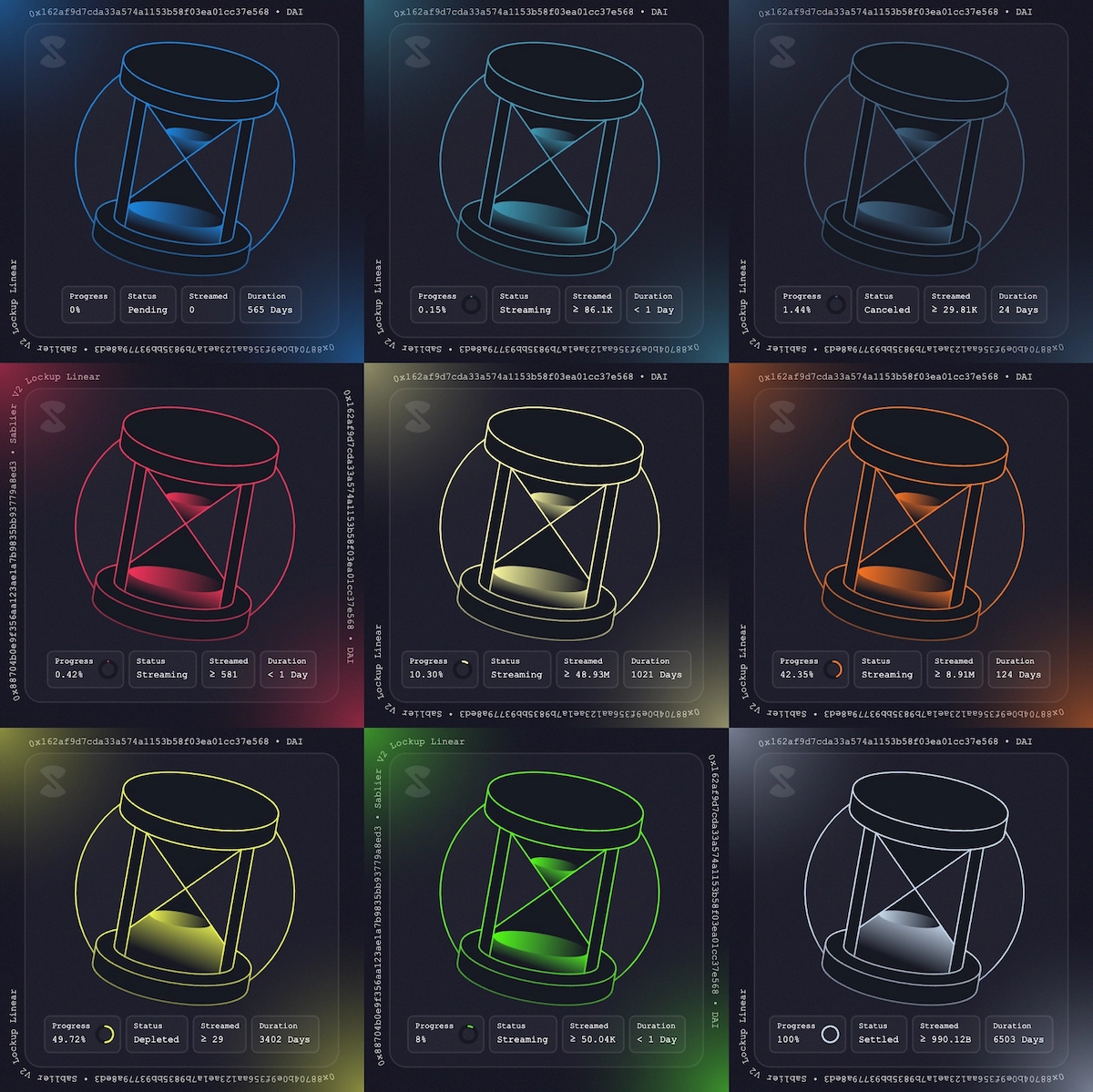 Sablier Lockup streams are represented as unique onchain generated hourglass SVGs, which change their color and content based on user data. Here's an example for a stream that is 42.35% way through: